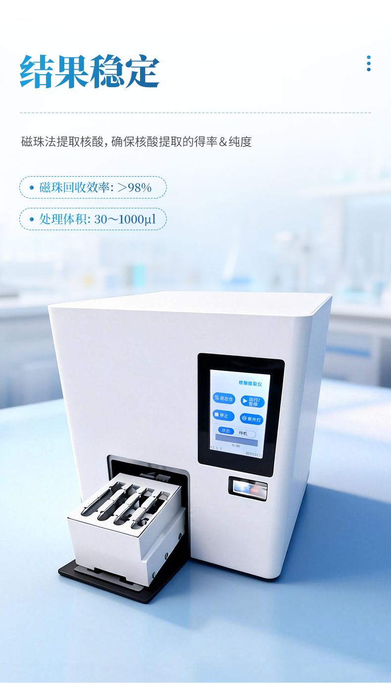 核酸提取儀通過磁珠法提取核酸,選擇相應(yīng)的試劑盒就可以自動的從多種樣品材料如血液、組織、細(xì)胞中分離純化高純度的核酸。具有兼容性強(qiáng)(適配預(yù)封裝提取試劑盒,也可適配單頭份試劑)、提取速度快、提取回收率高、操作簡便的優(yōu)點,是分子生物學(xué)實驗室檢測試驗的得力“助手”??蓮V泛應(yīng)用于科學(xué)研究、分子診斷、動植物疫病檢測等領(lǐng)域。